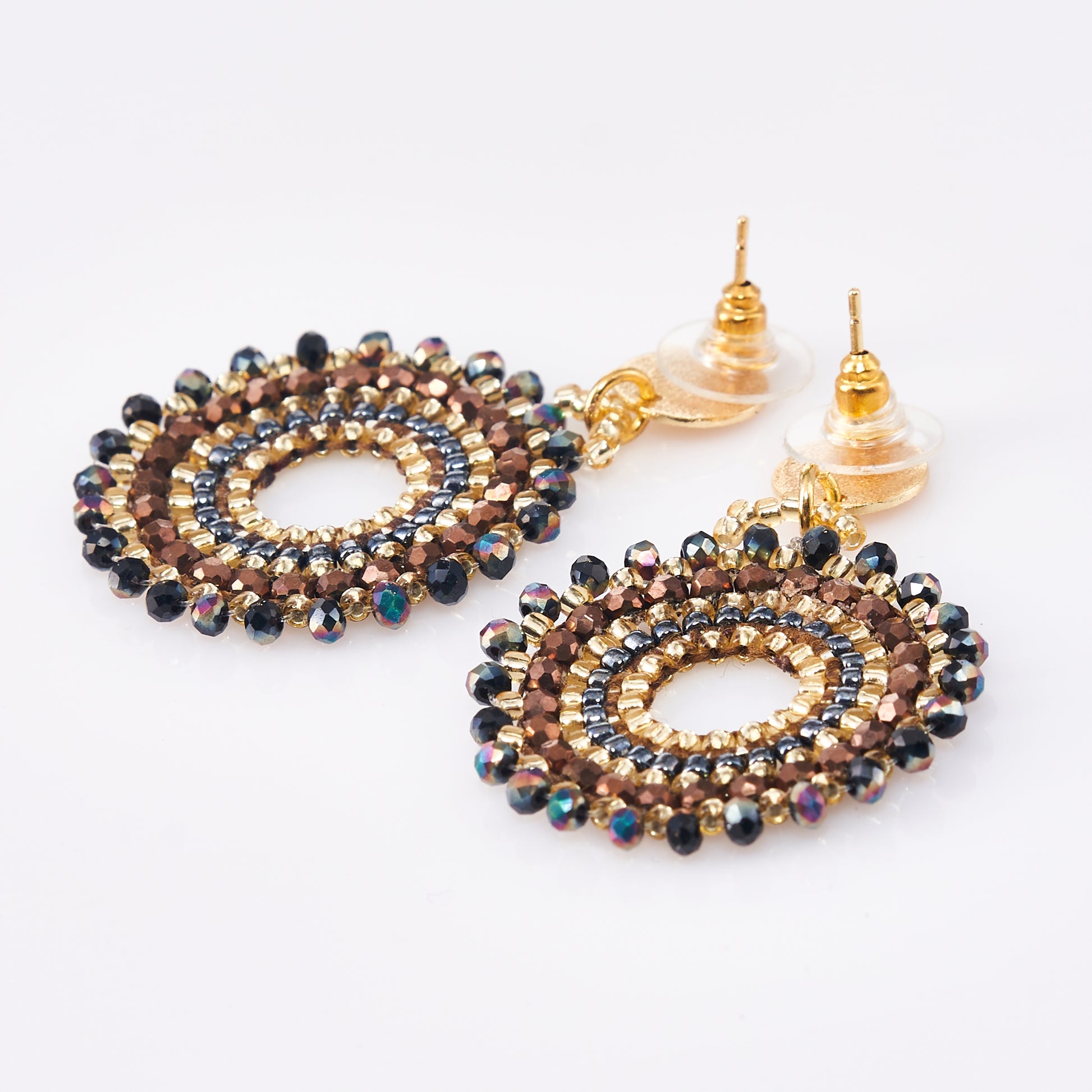 Drop earrings featuring tiers of abalone suspended from silver coin posts.